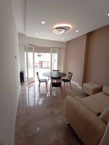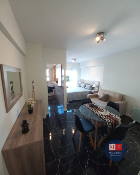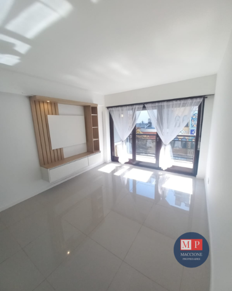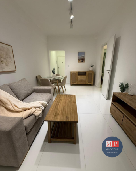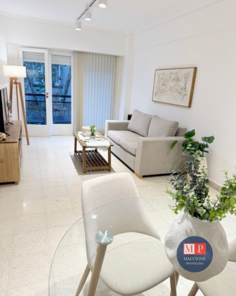 Living de ingreso, totalmente amoblado, con calefactor tiro balanceado, y ventanal al patio interno.